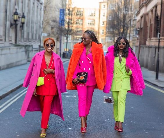 Here, the color palette should be considered the brighter, the better. Colors like electric blue, fuchsia, chartreuse green, and sunny yellows. And even bold prints. Color blocking will become your friend.