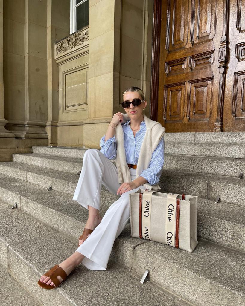 An example of a dopamine-based and a quiet accent can be wearing a floral-print maxi dress. Or a chartreuse knit co-ord. You can anchor this entire look with a quiet luxury piece. For example, you can throw a navy oversized wool blazer over the dress. Or also carry an unbranded and structured leather tote with the knit set. The quality and the classic shape will instantly elevate the base.